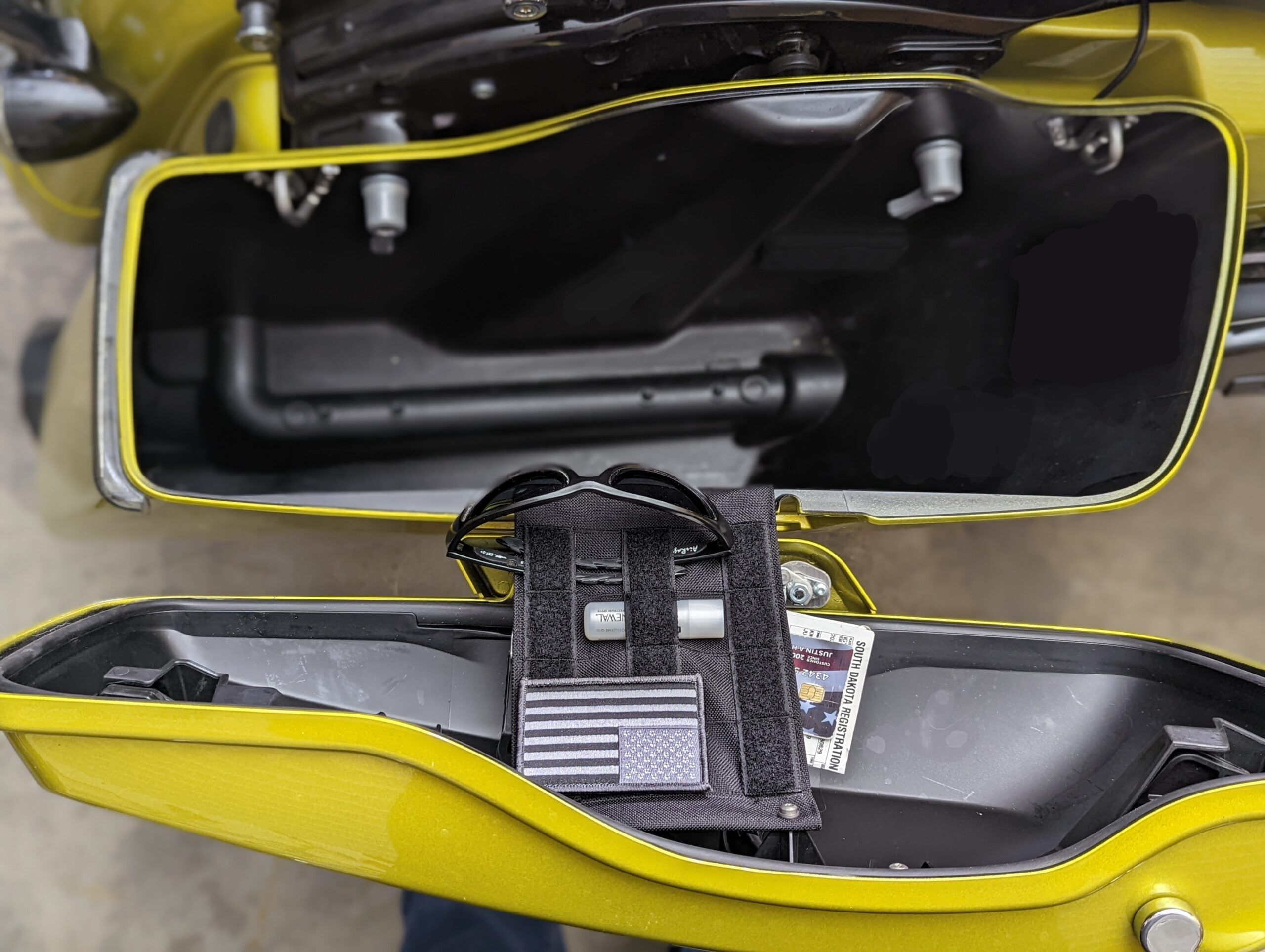 The Original Tactitether replaces your factory saddlebag tether in size fit and function. What it ads is a hidden inner pouch for cash, insurance, registration, and other small items. It also give you the ability to add any MOLLE compatible pouches to the face of the tether or just use the loops to hang your shades. The face of the tether is also covered in 3M loop Velcro so you can add your favorite patches along your journey.